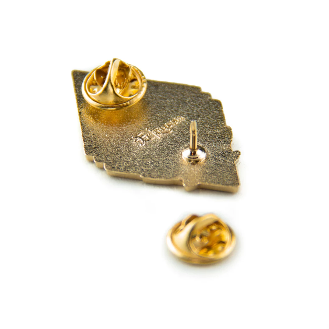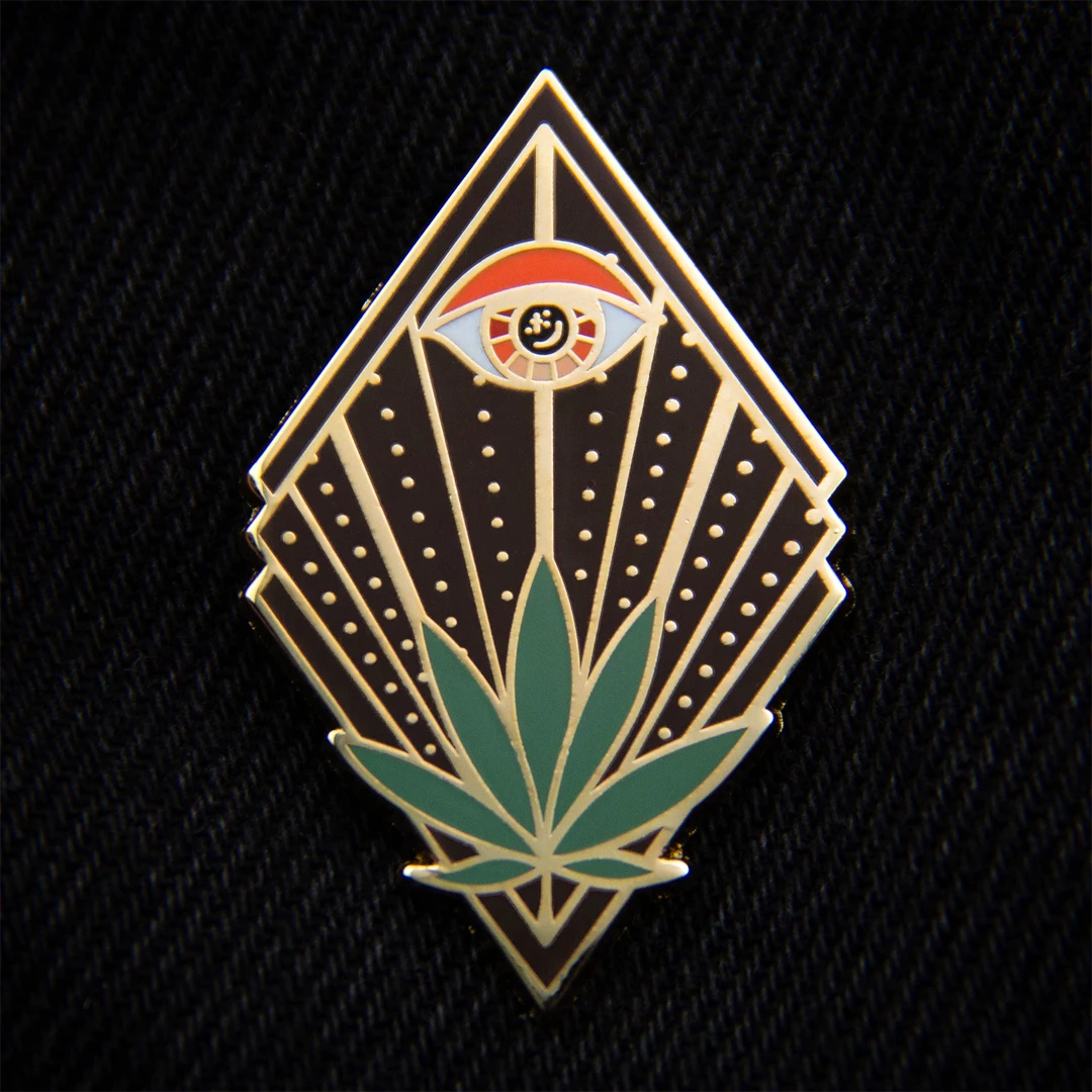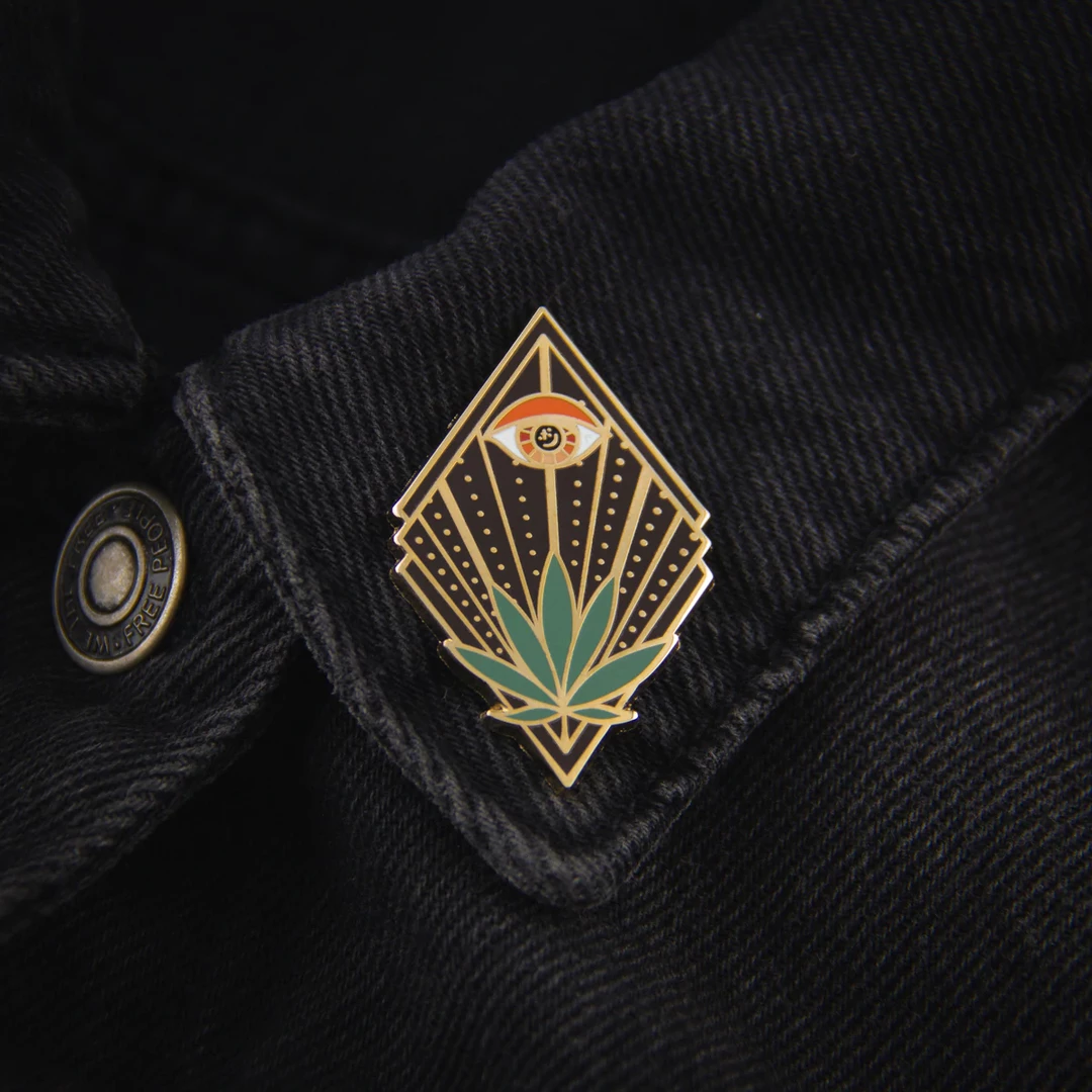 This geometric art deco inspired enamel pin features an all seeing eye looking down upon a single marijuana leaf. It’s a tasteful accessory for anyone who partakes.