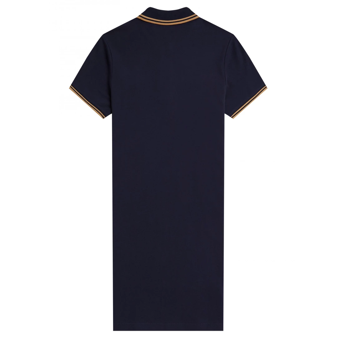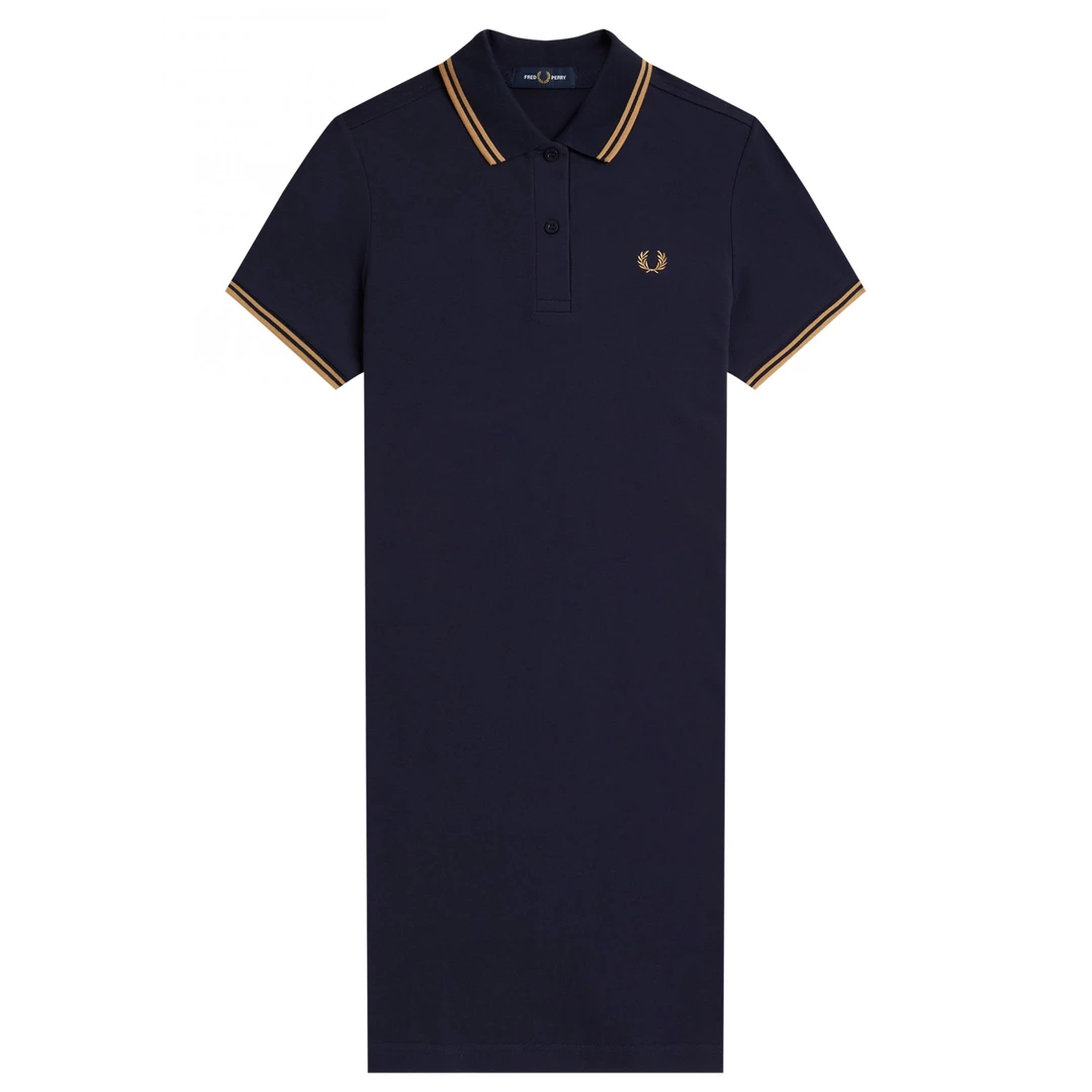 This cotton tennis dress is inspired by Fred Perry’s classic polos. Using the Fred Perry Shirt as its starting point, this adaptation has a straight fit and their signature twin tipping at the collar and cuff. With a dark carbon blue as the base, this dress features twin tipped stripes in gold, with coordinating laurel embroidery on the chest, finished with a two button placket. Classic and so easy to wear!