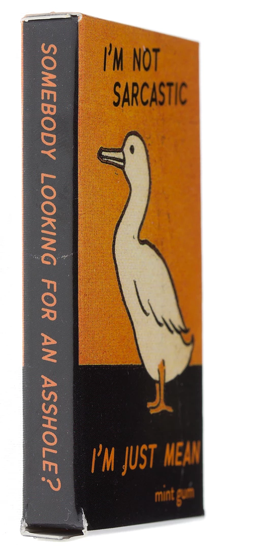 Somebody looking for an asshole? I’m not sarcastic, I’m just mean. For those moments when you don’t have time for humility… Each box contains 8 pieces of candy-coated, mint-flavored gum.