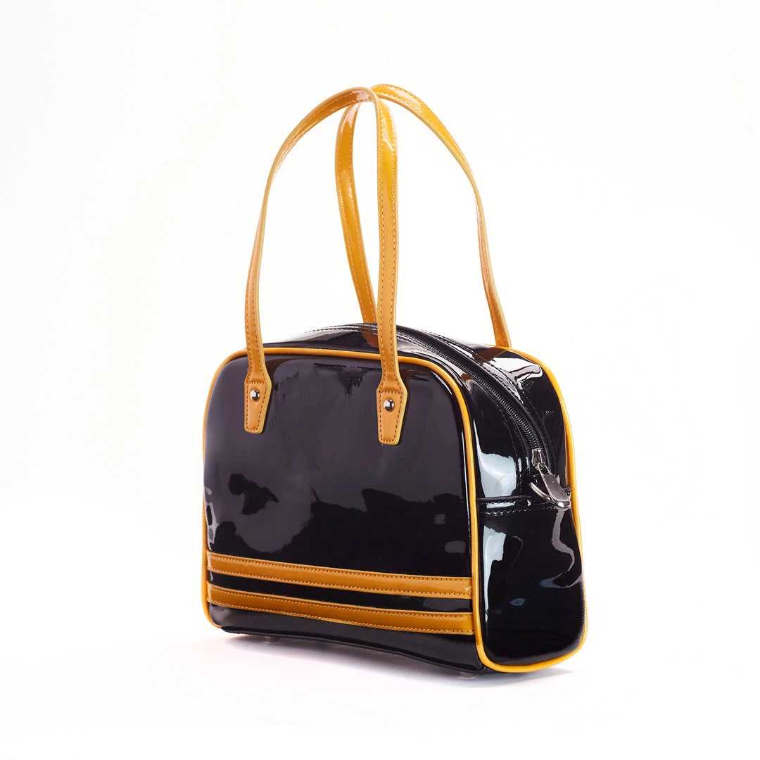 The Bovver gig bag is made of a high quality black vinyl gloss with yellow laser cut vinyl lettering and details. The handles are reinforced and finished with round silver studs. A detachable crossover strap makes it easy to carry when your hands are full or you’re busy dancing. A special note, the inside is lined with black and white houndstooth pattern complete with inside pockets.
