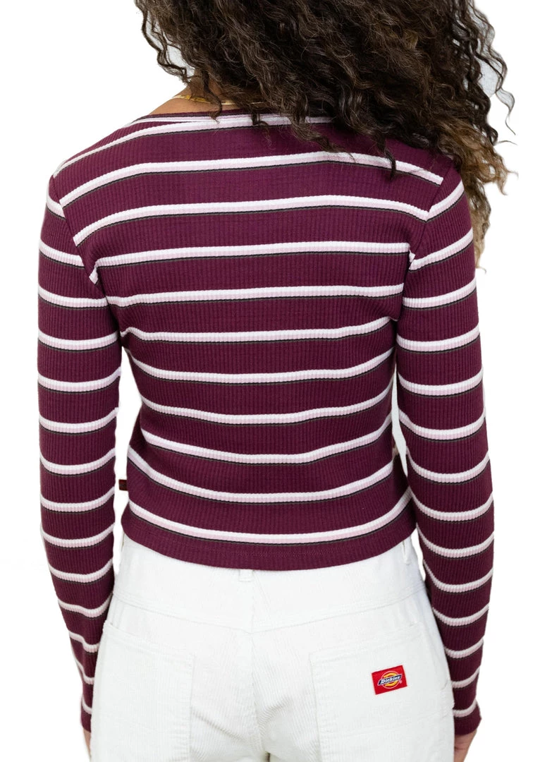 This long sleeve tee from Dickies Girl has a horizontal striped pattern in burgundy, white and pale pink, an embroidered Dickies logo on the left chest, and a crew neckline. It’s perfect for wearing in layered looks or on it’s own.