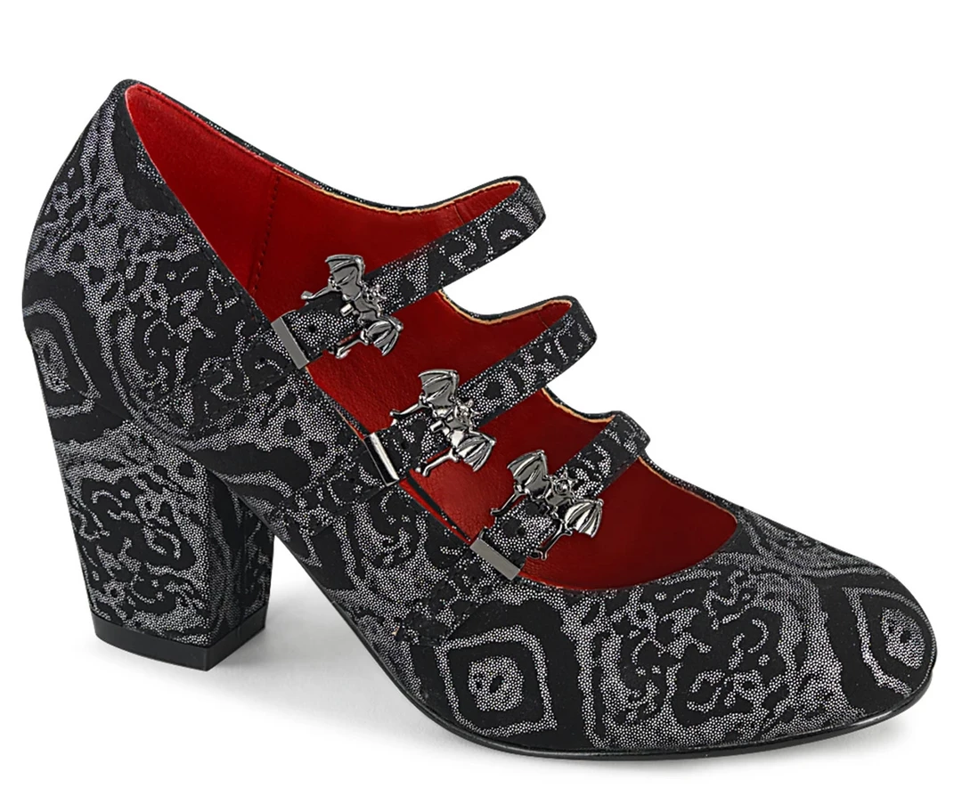 Step out into the night in these batty mary jane heels from Demonia! Made of a high quality vegan faux suede with an abstract snakeskin print in silver, the Vivika Mary Jane is a round toe style with blood red lining and boasts amazing triple straps that fasten with bat shaped buckle details. The 3″ block heel gives you some height while keeping you comfortable. Just add your favorite black dress!