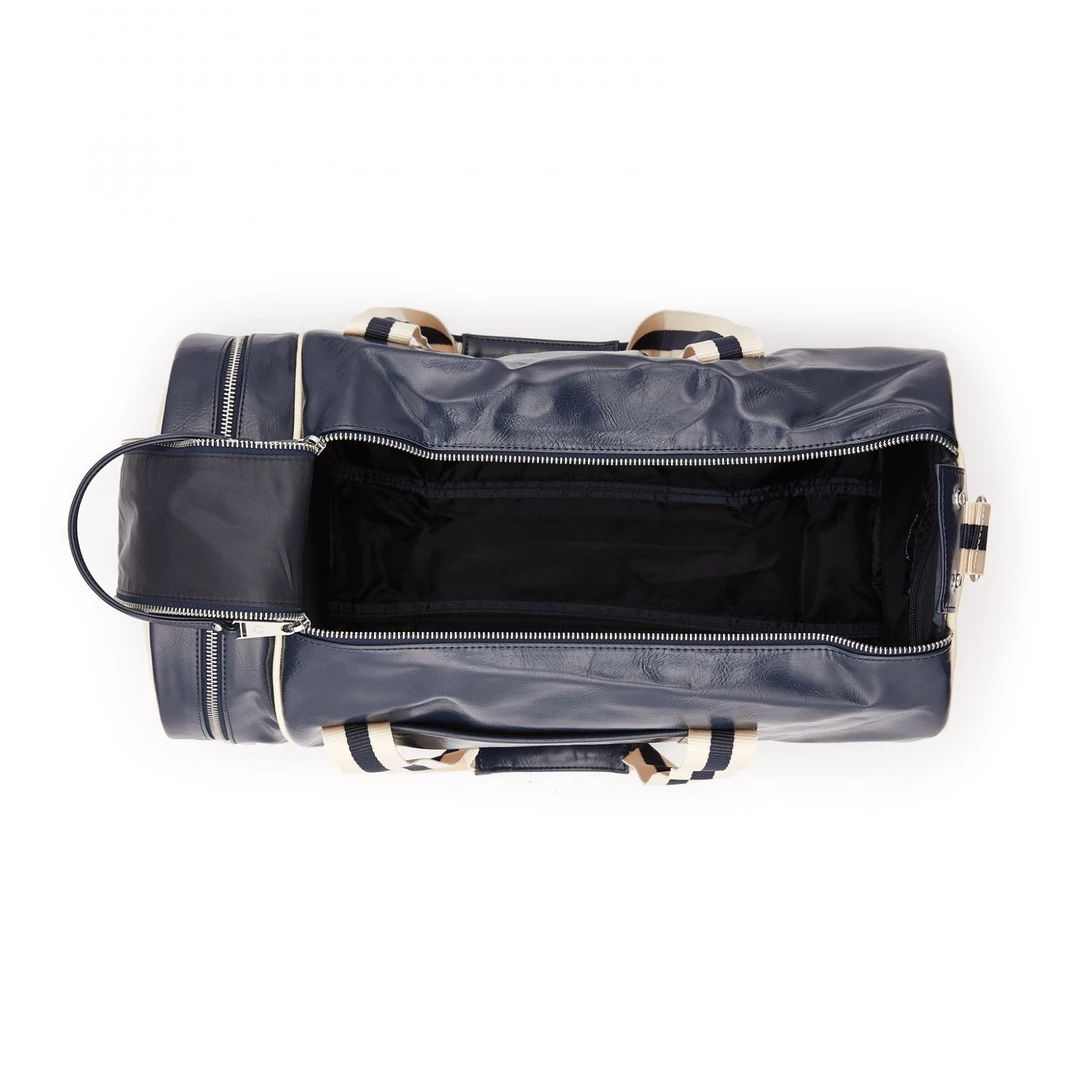 Used by sportsmen and women for decades, the classic Fred Perry Barrel Bag remains unchanged. Crafted from a tough PU in navy blue with ecru accents, this bag features strong webbing handles, debossed branding, silver-tone hardware, double-zip closure and a zipped compartment at one end. The interior has an additional zip pocket and zip compartment. Functional, durable and unmistakably Fred Perry.