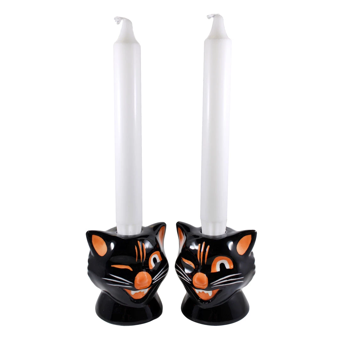 We’ve taken our favorite vintage Halloween familiar and turned him into all new candle holders! Create some black cat magic anywhere in your home with our charming Black Cat Candle Holders. Made of ceramic, you will get a set of two – each can hold a standard taper candle.