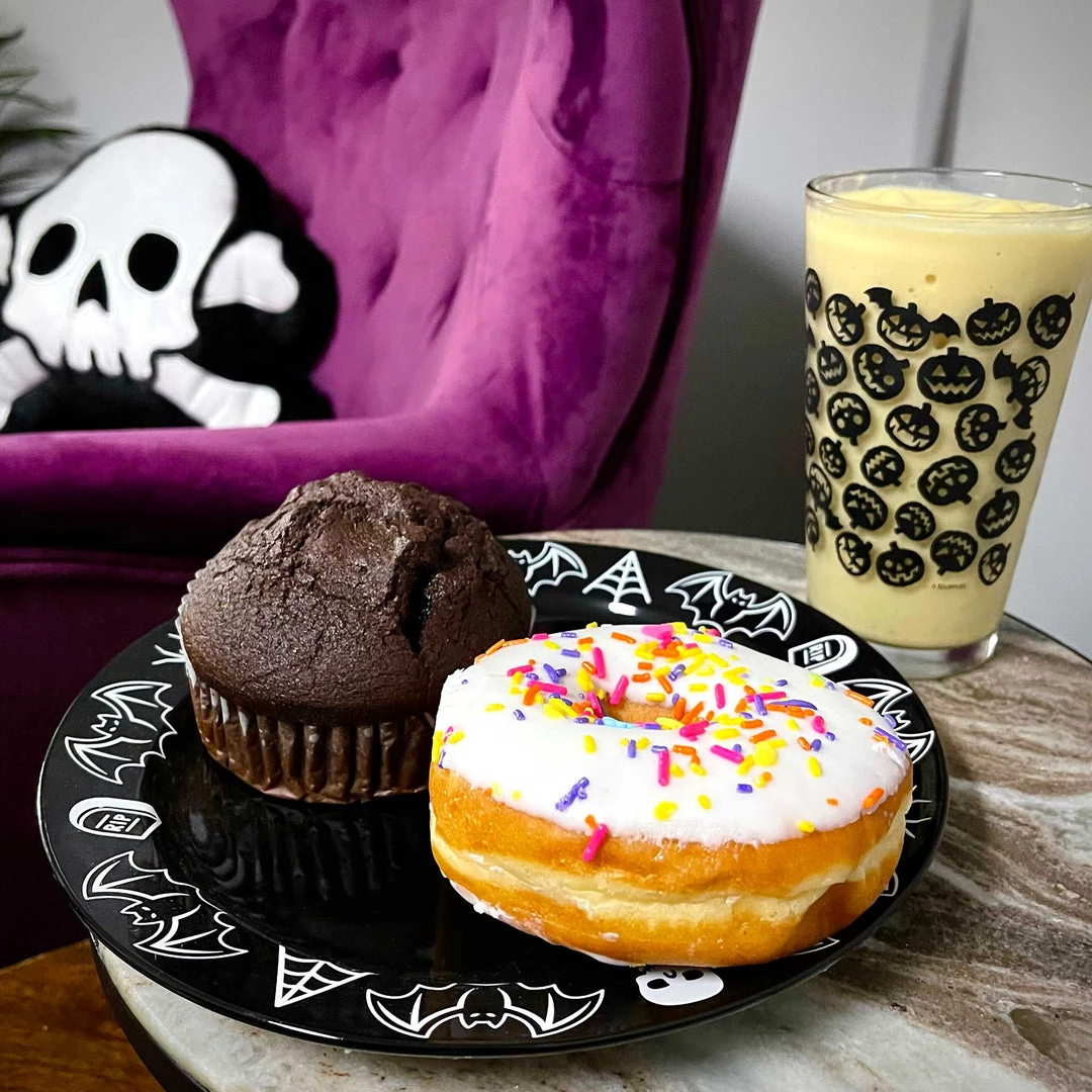 Dinner will be even tastier on the creepy and cute plates. Made of a shiny black porcelain with a white printed edge filled with bats, spiders, webs and coffins.