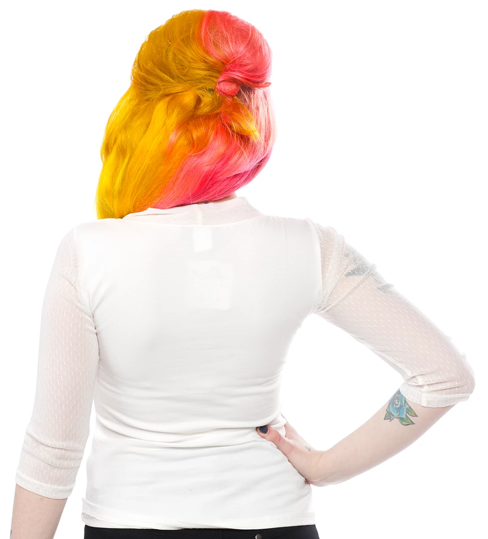 The Inspire Top from Heart of Haute is your go-to top to look dressed up while still being comfy. This high quality knit jersey top in ivory features a tie front collar and 3/4 length sleeves, which both have a polka dot lace detail.