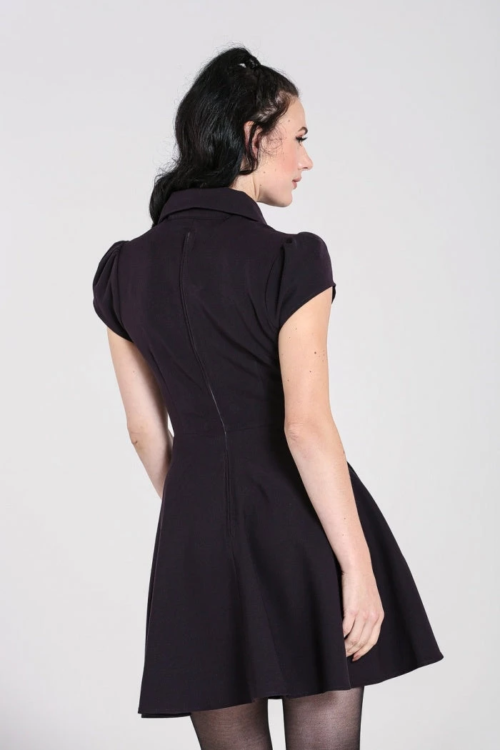 A dress for every occasion! The Carlie Mini Dress from Hell Bunny is a classic fit-n-flare silhouette complete with a button-up bodice, pointed collar, pockets and cap sleeves. Made of a gorgeous, deep purple woven fabric, it almost appears black in some lighting. Easily dresses up or down for a variety of ways to wear! Hidden zip fastening on center back.
