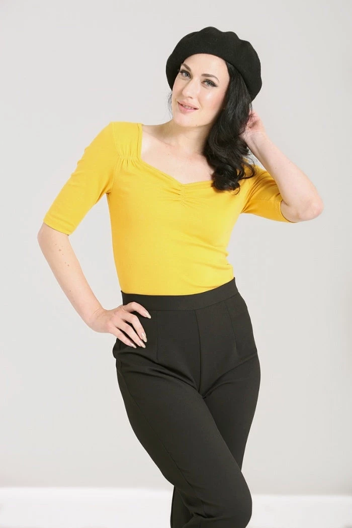 If you’re looking for the perfect basic top, look no further! This Philippa Top from Hell Bunny is a great match to skirts and pants alike with it’s ruched detailing at the sweetheart neck and 3/4 sleeves. It’s made of a soft and stretchy jersey fabric in a gorgeous shade of mustard yellow – perfect for fall!