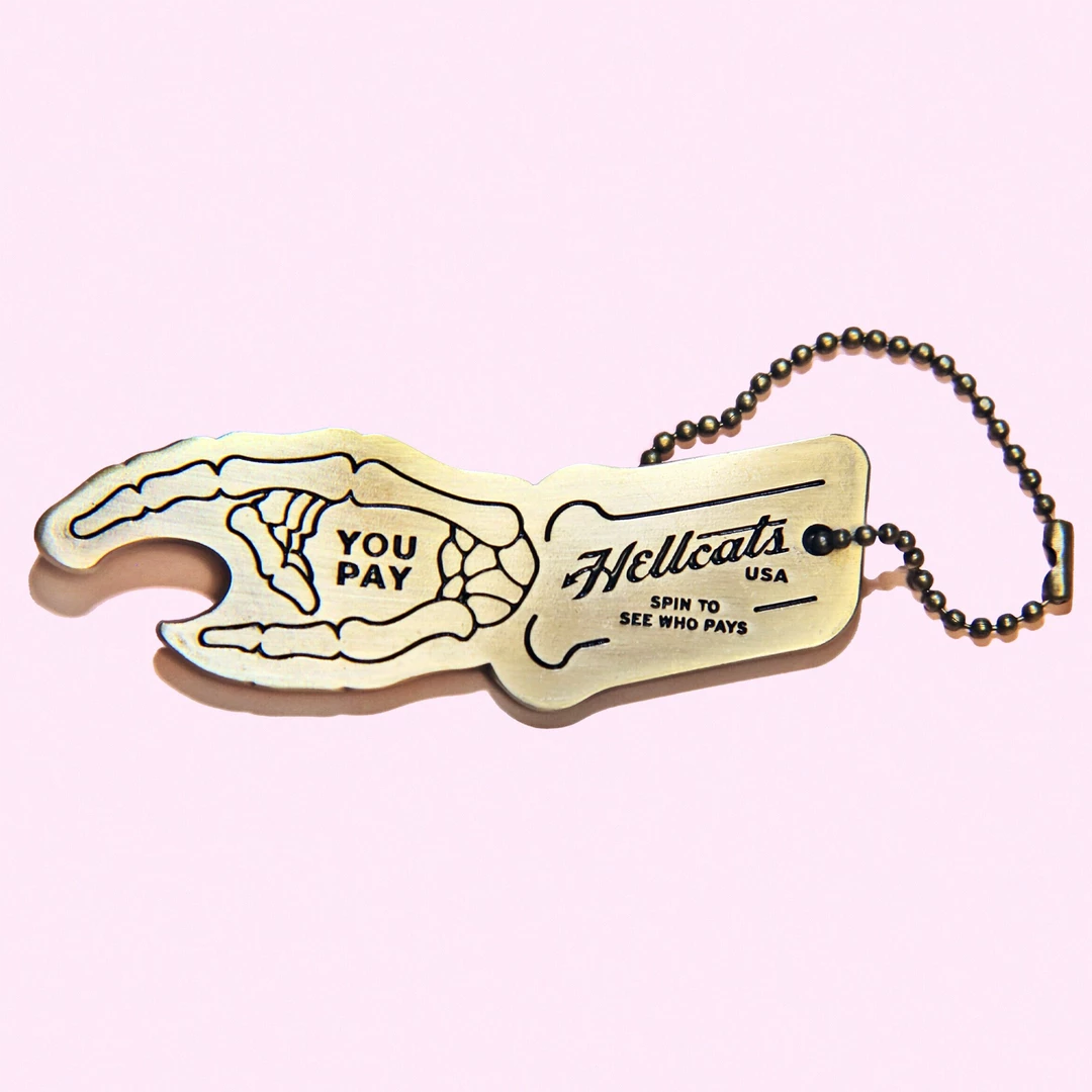 Spin it to see who pays! This handy Skeleton Hand spin keychain also doubles as a bottle opener. Brass finish.