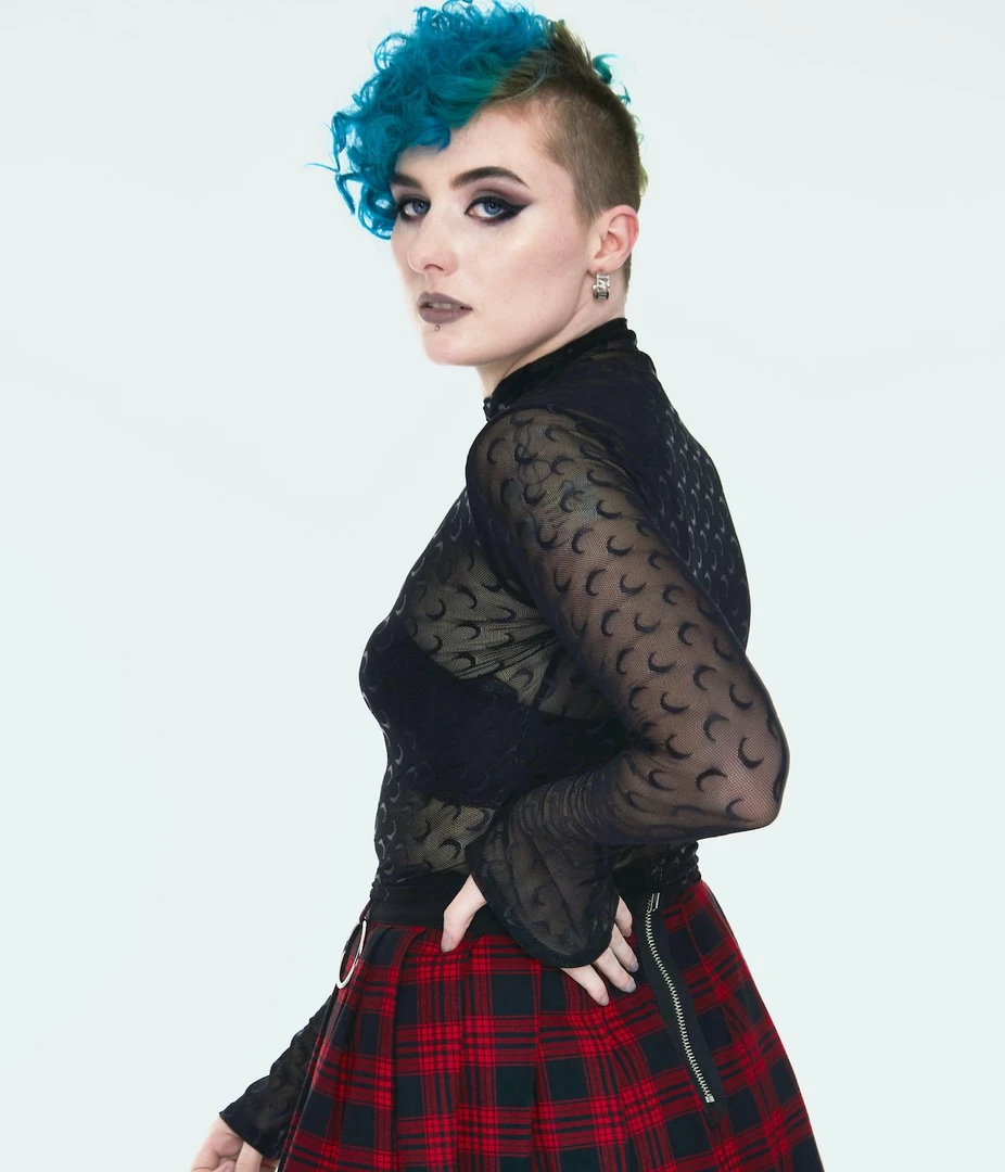 Get Moonstruck in this mesh top from Jawbreaker. Crescent Moons on a sheer mesh make this pullover top the perfect layering piece or looks great worn over a cami or bra (bra shown not included). Extra long sleeves for added drama. Super stretchy and pairs great with so many things!