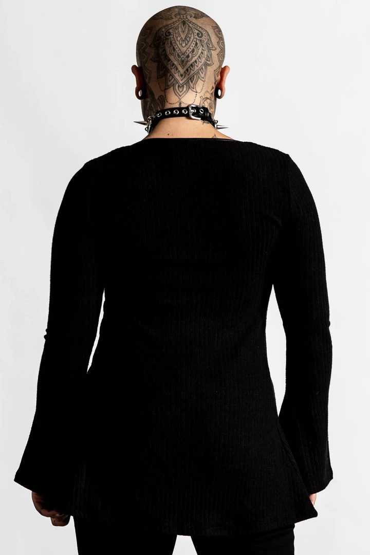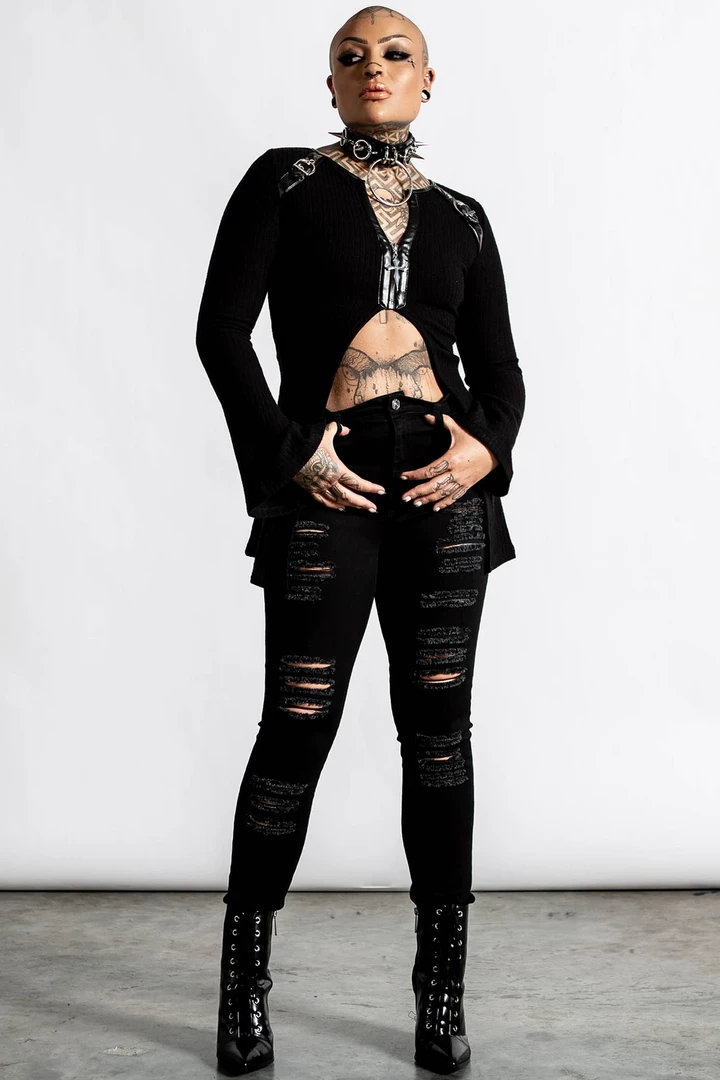 Be ready for any adventure in the Scorpia long sleeve top from Killstar. Made of a super soft cotton knit with just the right amount of stretch, this top features buckle details and open front with a cross shaped pull. Extra long bell sleeves for added drama. An essential piece – easy to wear and looks great layered too!