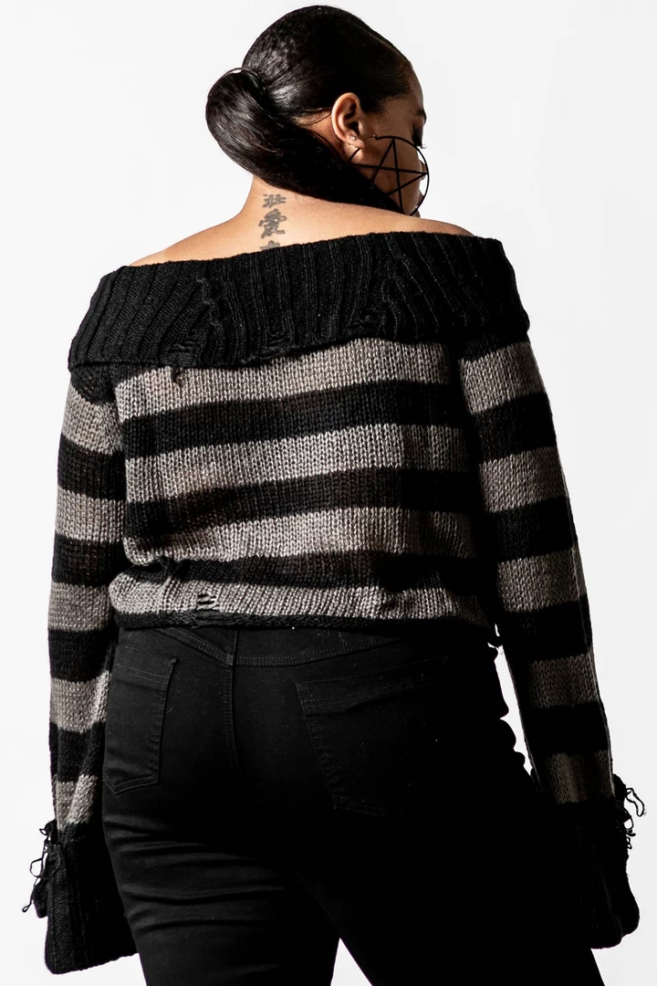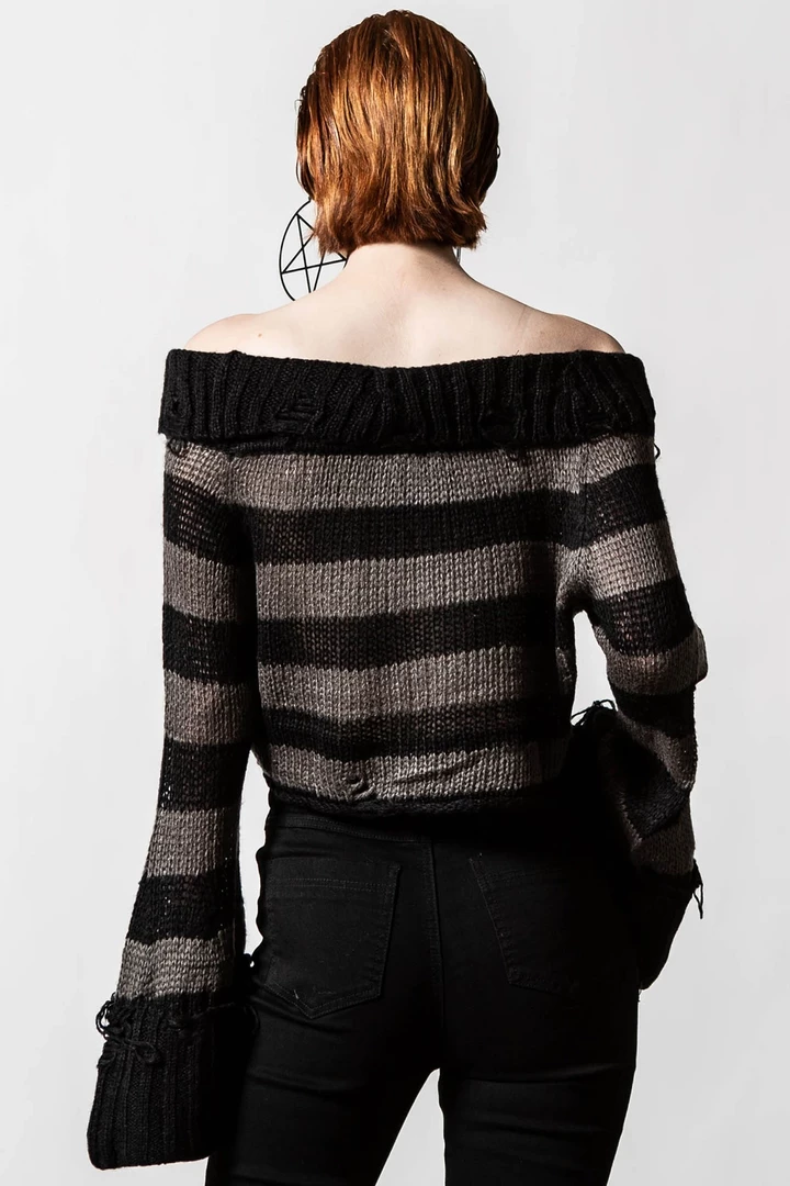 Look cute as hell in the Visage Knit Sweater from Killstar! This black and gray striped top was conjured using a super-soft fabric for a flattering yet comfortable fit. Features a gorgeous off the shoulder Bardot neckline, distressed details, statement contrasting stripes and crop style – no detail has been spared! This creepy lil staple piece is a dream to style and looks great with all your fav bottoms.