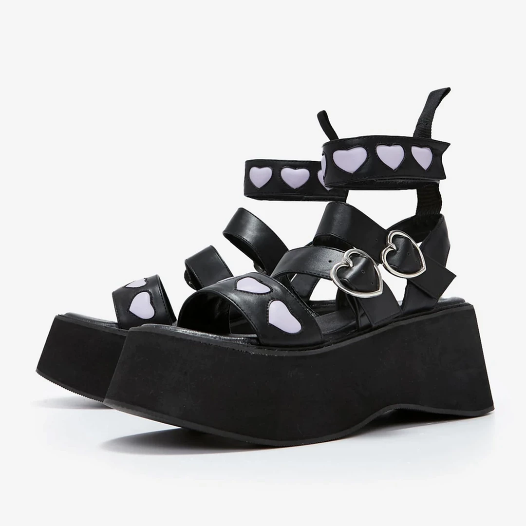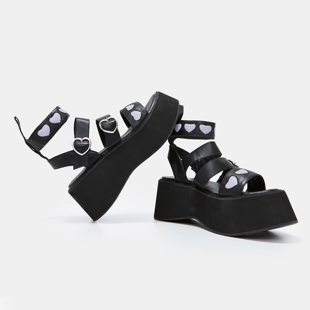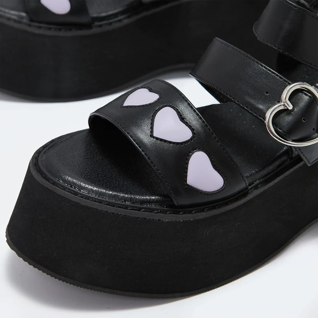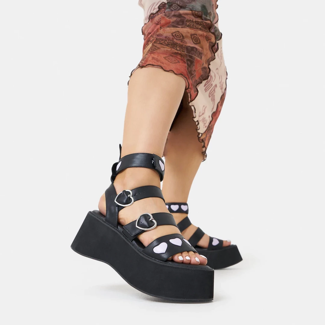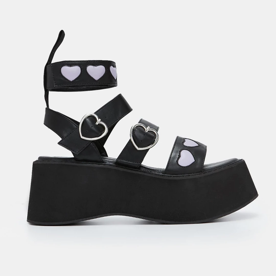 Pretty little thing, don’t put your heart on the line! The Lovergirl Sandals feature lilac hued hearts all over, two heart shaped side buckles, thick velcro closure, cushioned insole and a platform wedge upper. All shoes are made from water based PU, manufactured using regenerated water – animal free, of course!