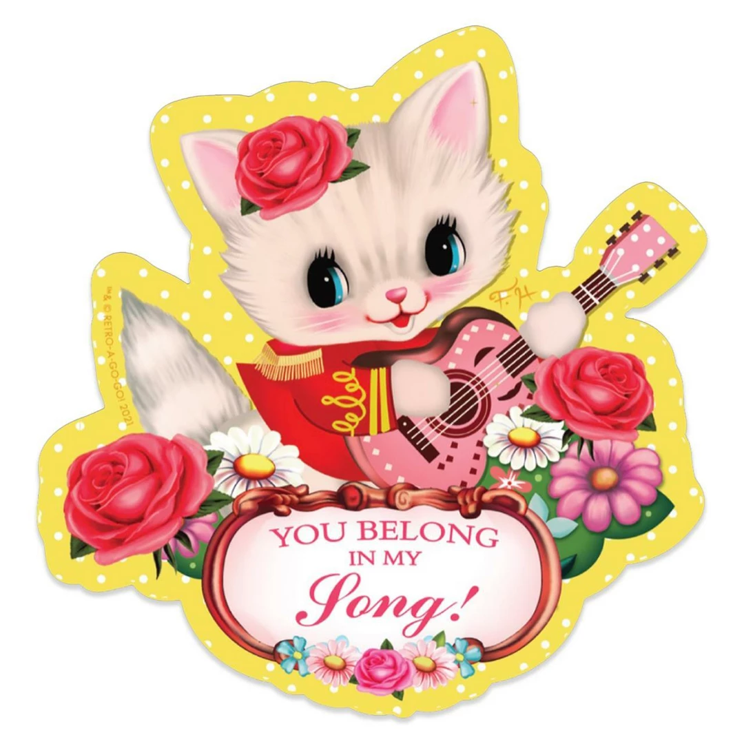 Listen and you’ll hear the pink guitar play, not just once, but several times a day. “You belong in my song” sweet kitty will sing, her voice is filled with sunshine and has a beautiful ring. This sweet sticker from Retro A Go Go features the adorable artwork of Fiona Hewitt and is suitable for both indoor and outdoor use.