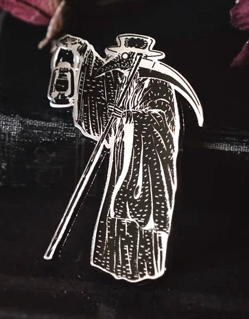 You worry too much, you make yourself sad. You can’t change fate, but don’t feel so bad. Enjoy it while you can – it’s just like the weather. So quit complaining brother, NO ONE LIVES FOREVER. This Lively Ghosts enamel pin is an homage to Oingo Boingo, tarot [The Hermit], Led Zeppelin posters, plague doctors, and of course – the Grim Reaper. Beautifully detailed!