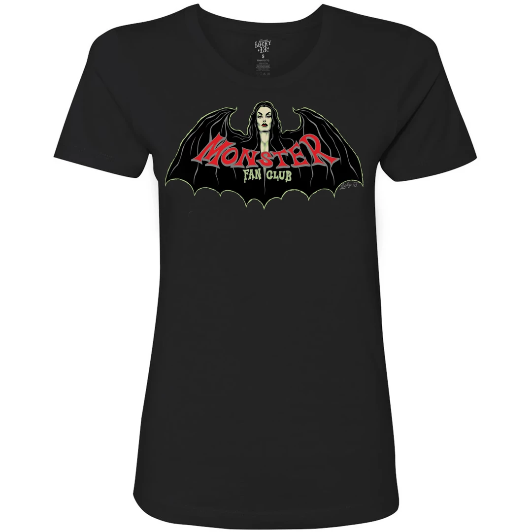 Join the Monster Fan Club with this awesome Bat Vamp crew neck tee from Lucky 13. This fitted ladies tee has their original “Bat Vamp” Monster Fan Club print on the front chest.