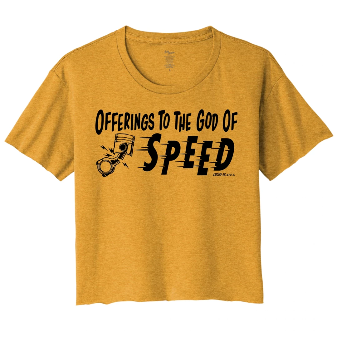 Make an offering to the god of speed in this fun crop tee from Lucky 13! A great shade of antiqued gold, this tee has a graphic on the front with raw edge sleeves and bottom hem.