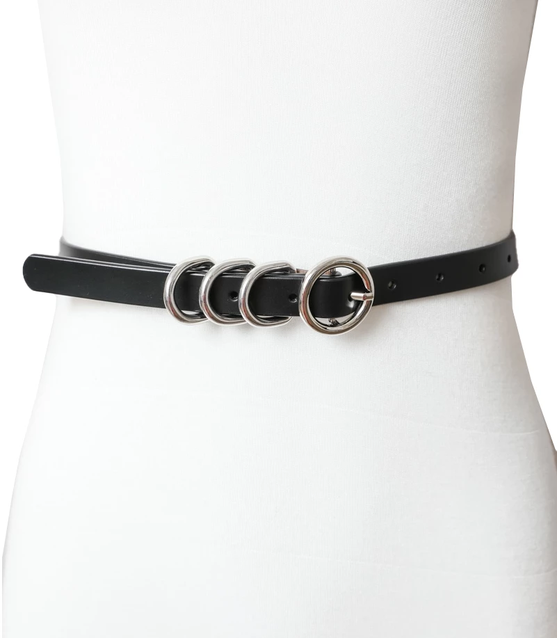 Four rings to rule them all! This skinny black leather belt features a unique quadruple ring buckle for added interest. Pairs great over dresses!