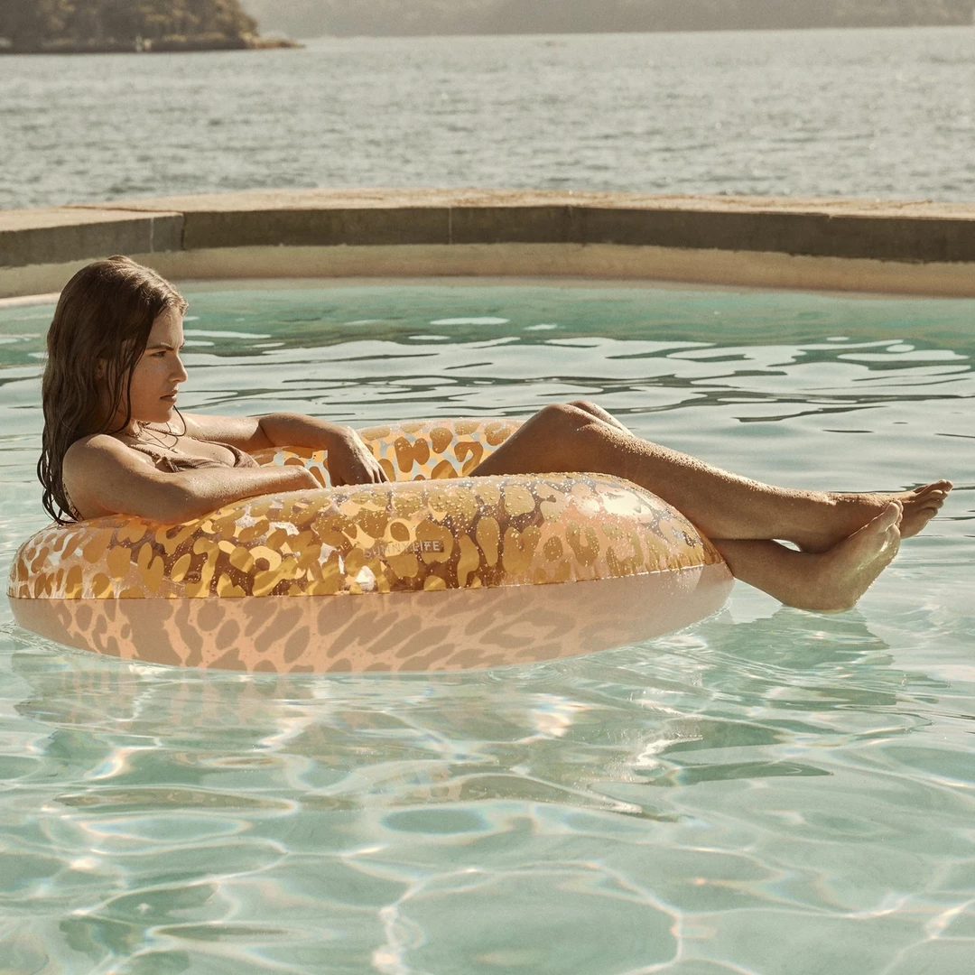 Let out your wild side with this shimmering golden leopard print pool float! Made of durable, non-toxic, phthalate-free PVC, this inflatable pool ring is sure to add some glam to your poolside hangs.