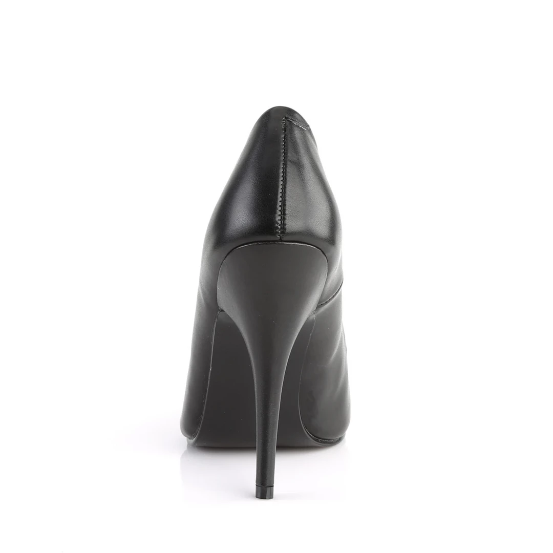 Command attention in these classic pointed toe pumps in black faux leather. With a 5″ heel, they pair great with a variety of looks from pinup to punk.