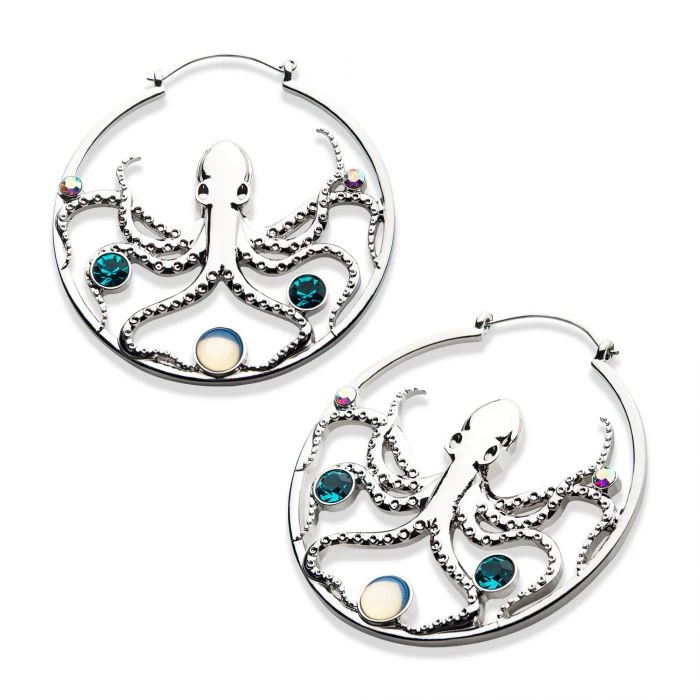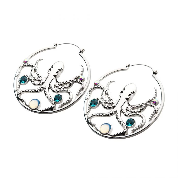 This friendly octopus wants to show off his treasures! Aurora Borealis, Blue Zircon & White Opalite gems dance among his tentacles in these gorgeous hoops. They are suitable for wear with stretched lobes and pierced ears alike.