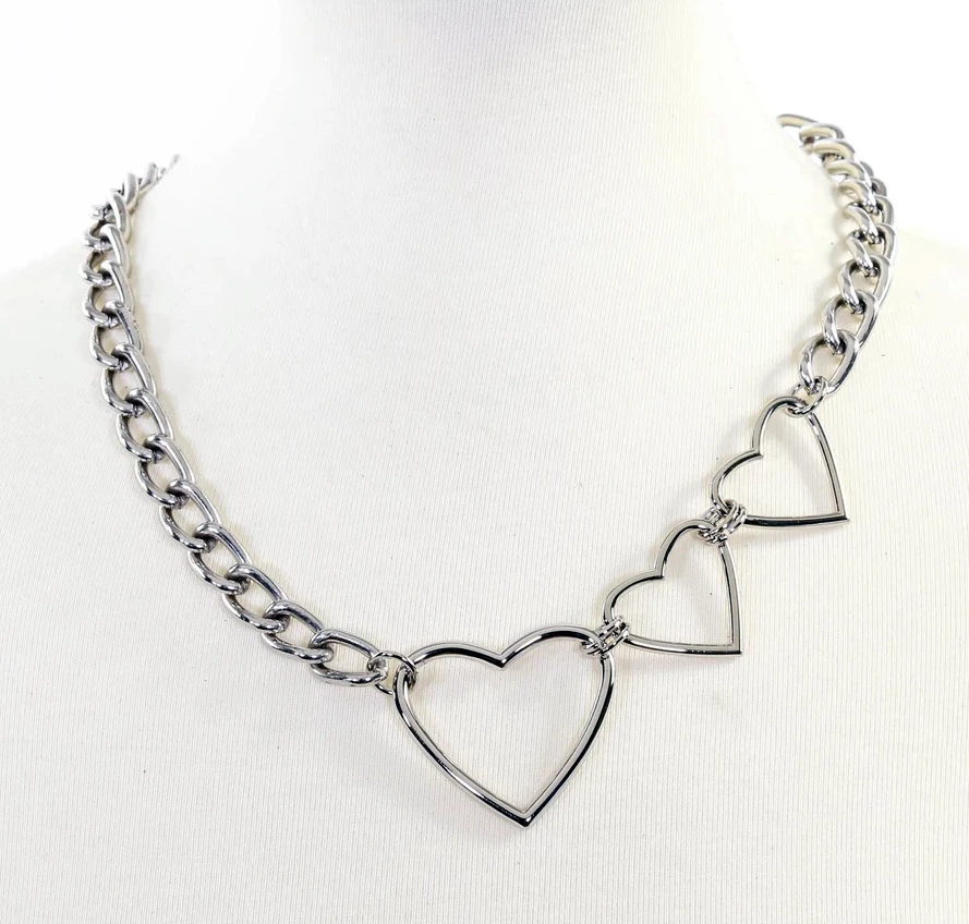 You’ll be falling for this necklace over and over thanks to the three linked hearts in cascading sizes on a matching silver chain. Fastens in back with a clasp.