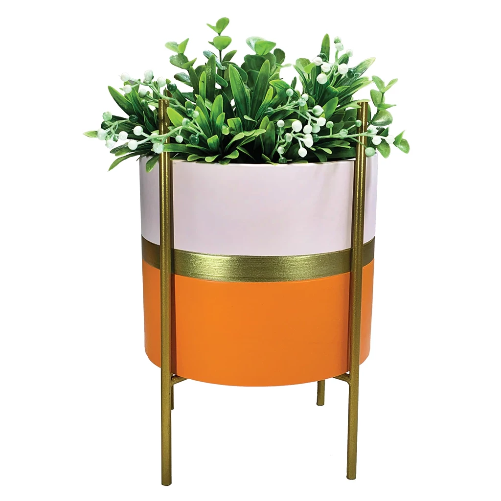 Add a splash of retro color to your home decor with this modernist planter in pink and orange. It comes with a gold stand that allows two different heights for the planter, depending on how you turn it.