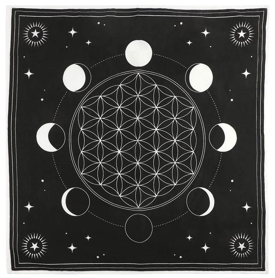Channel the powerful energy of crystal healing with this cotton altar cloth with printed moon phase design and Flower of Life crystal grid printed in its center. Perfect for arranging crystals and clearing the mind.