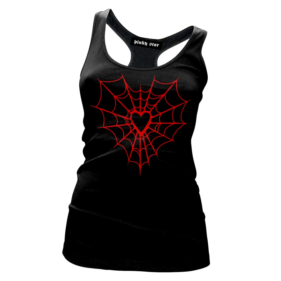 Shake off those cobwebs with this Web Heart tank from Pinky Star. This sweetly spooky design is printed in red on a soft, 100% cotton, black racerback style tank.