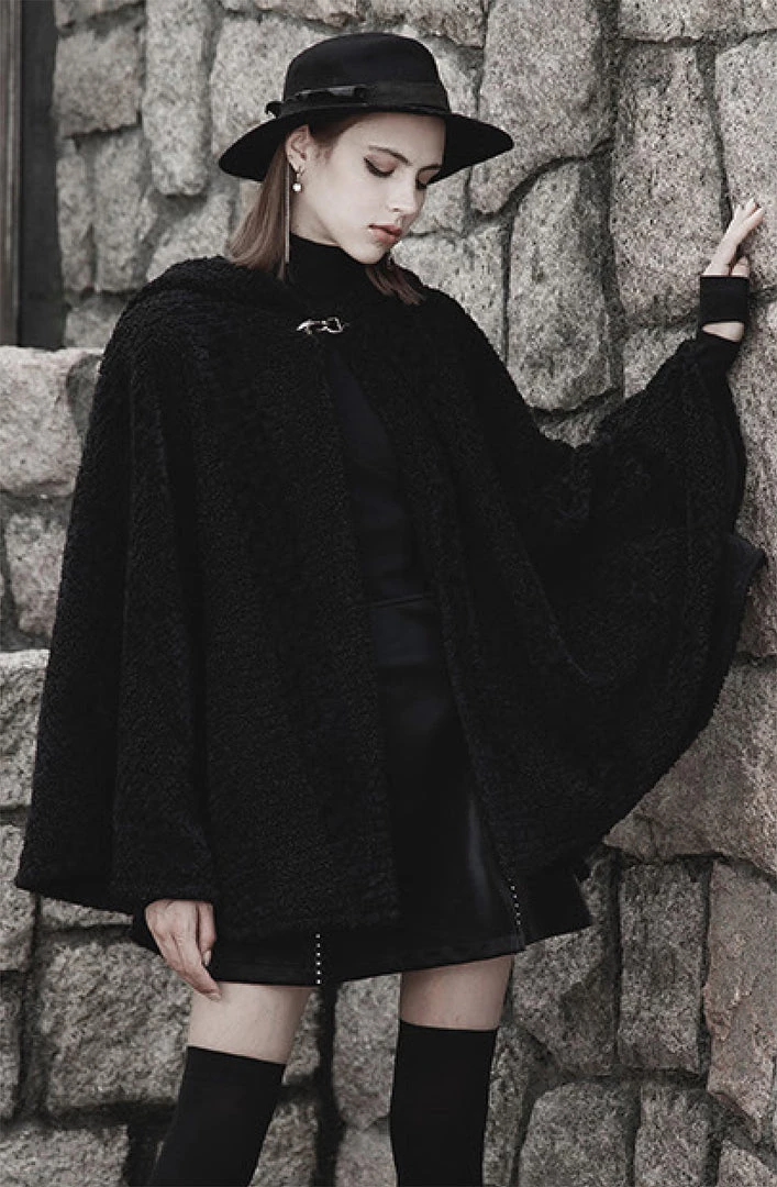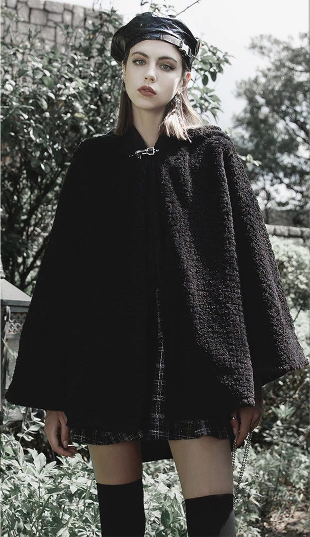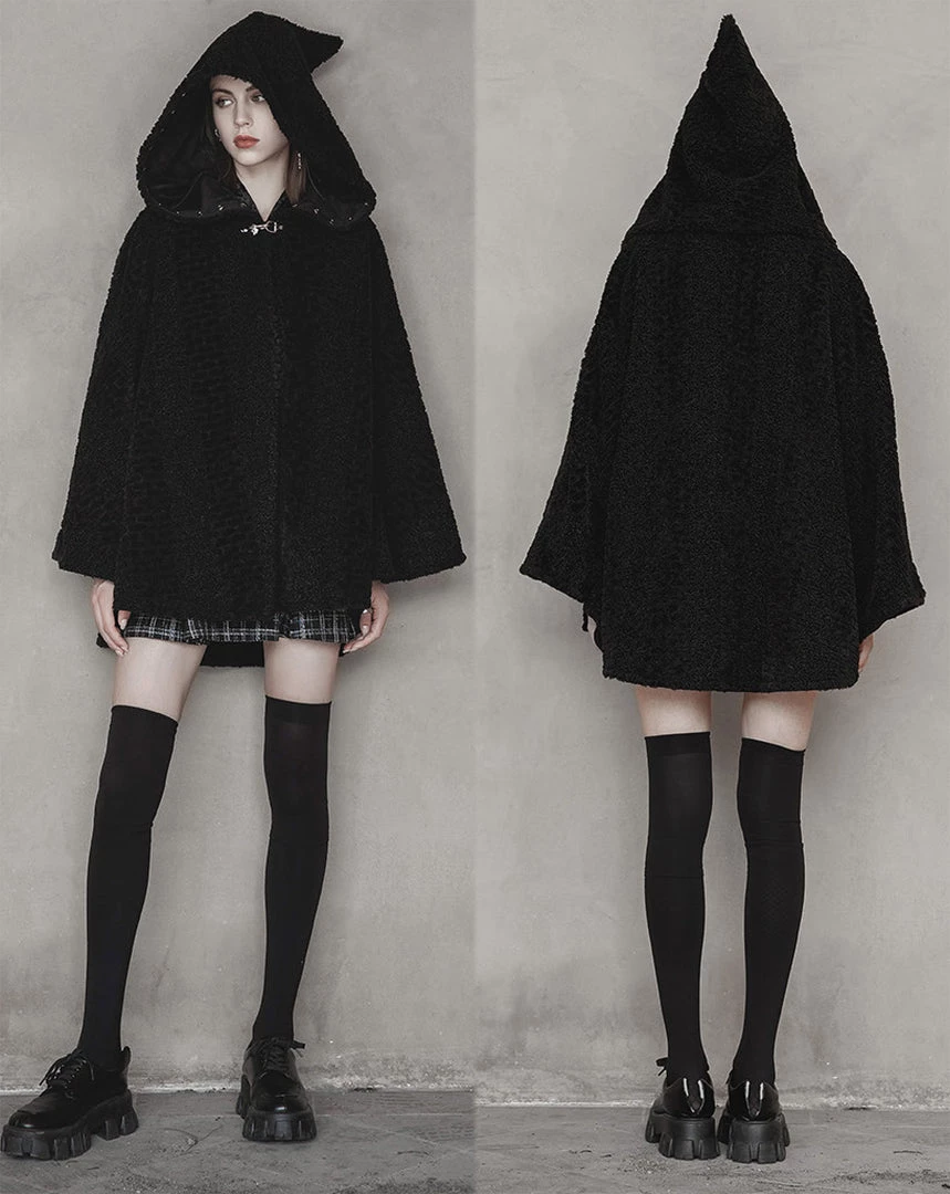 Perfect for chilly nights in the forest with your coven, the Salem Hooded Plush Cape Coat from Punk Rave is a witch’s dream come true! Made of a fuzzy black faux persian lamb fur, it has a pointed witch-hat shaped hood, complete with heart shaped studs. The cape fastens at the middle front with a metal buckle. There is a button at each sleeve that when buttoned up, it can be worn as a jacket. Unbutton for full cape-like potential.