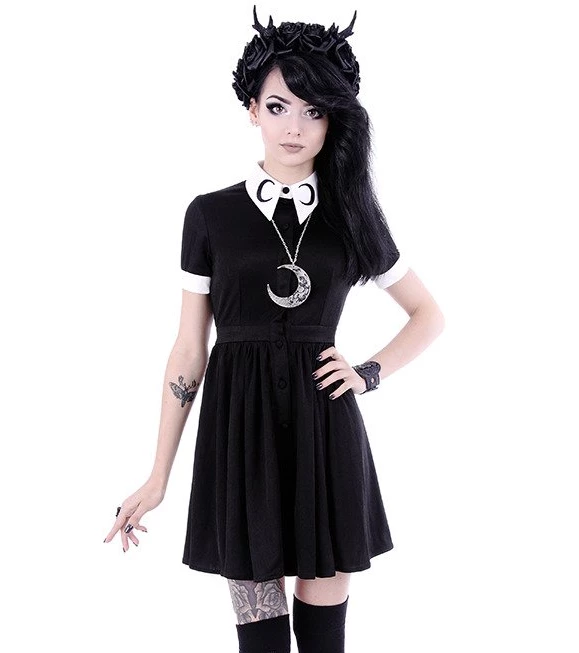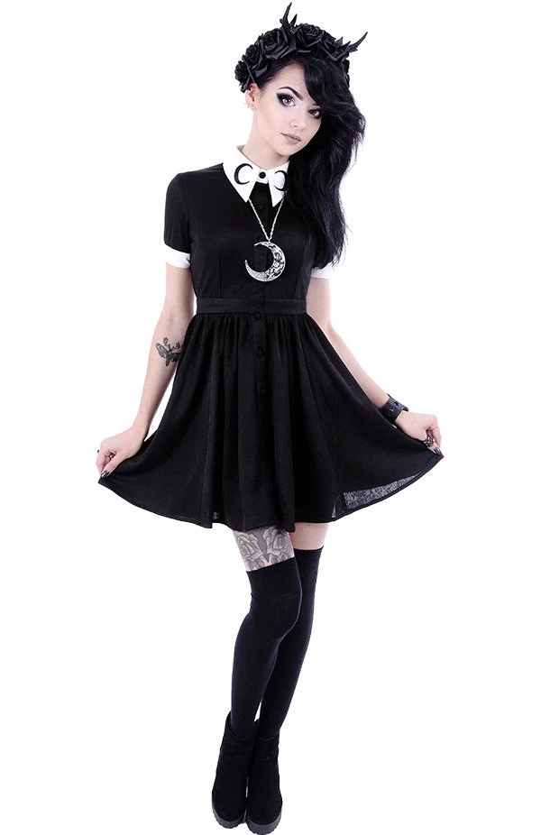 Perfect for all your phases, the Moon Collar Dress from Restyle is a black and white dream! Made of a soft, black fabric, this dress has a statement white collar decorated with crescent moon embroidery in black. The short sleeves have contrast white cuffs with buttons and the dress fastens up the front with matching black buttons. It’s a classic fit and flare style which gives an amazing, hourglass shape to your silhouette!
