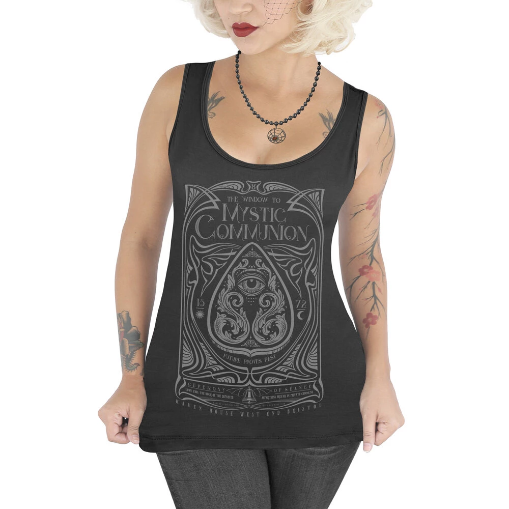 Open the window to Mystic Communion with this tank from Serpentine. This racerback style tank top features their original graphics in gray on black. Medium bodied, relaxed fit style tank.