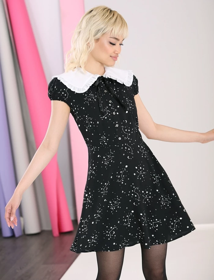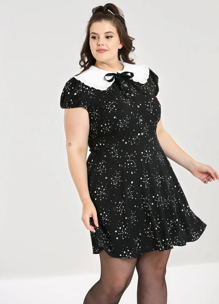 What’s your sign? Set your sights on the celestial stars above with this dreamy Zodiac Mini Dress from Hell Bunny! Crafted from a soft black material with an all over celestial print, it features silver glitter buttons down the front bodice and a large statement collar in white with a ruffle edge. At the center of the collar is a black glitter bow, which is removable if you wish. Zips down center back to fasten. Short sleeves with elasticated cuffs and side pockets complete this dress for a great outfit option any day of the week!