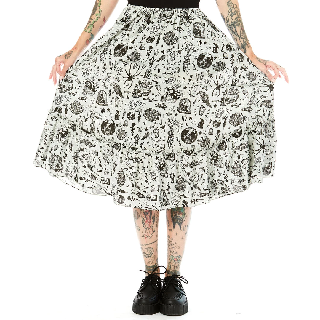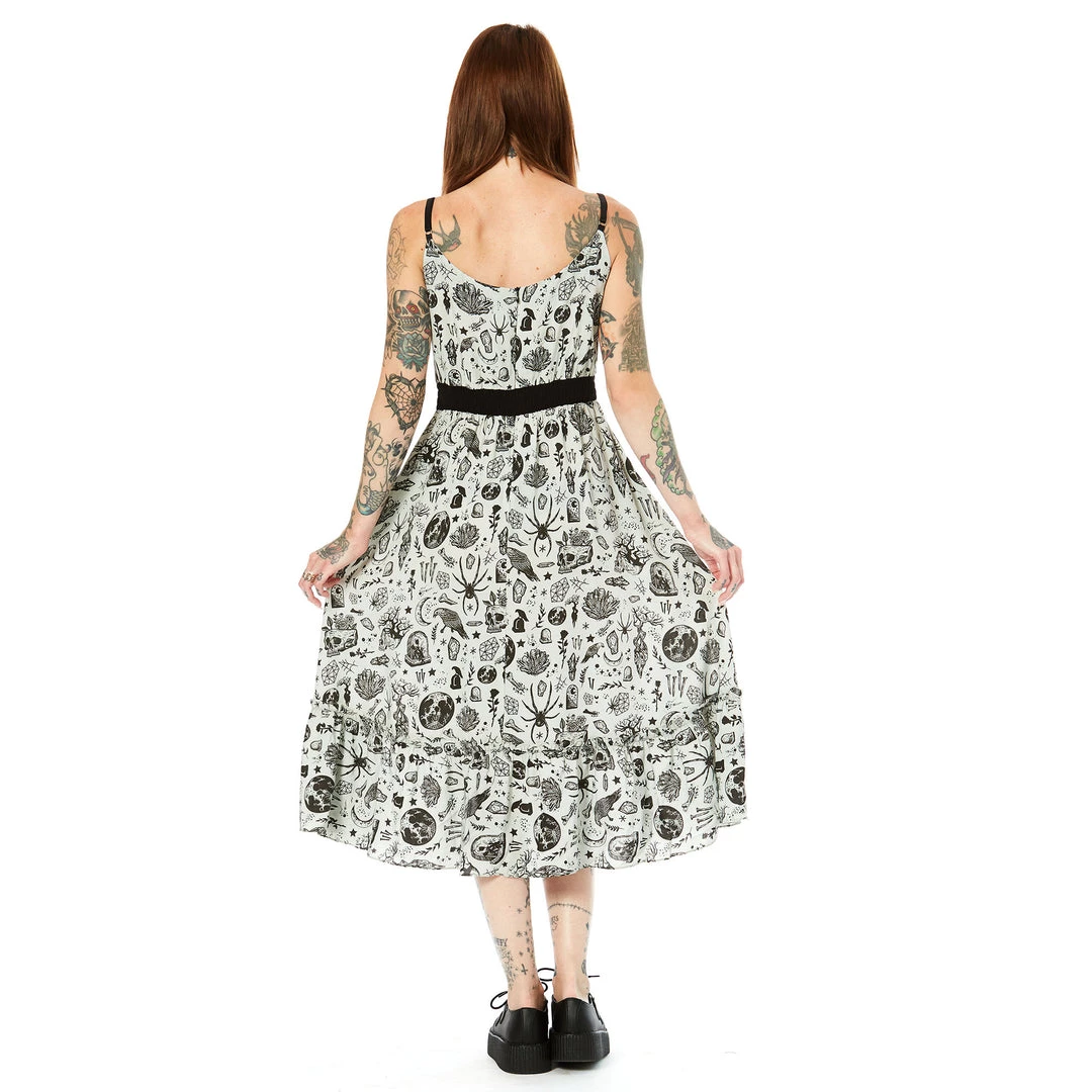 Introducing Stevie, the newest silhouette in the Sourpuss arsenal! The Night Walker Stevie Dress features artwork created by Villy Villain just for us – with tombstones, ravens, crystals, moons and so much more. The Stevie dress is made out of a soft rayon challis, with a flouncy bib detail on the chest, a midi length, adjustable bra-style straps, and smocking at the back waistband for a little extra wiggle room.