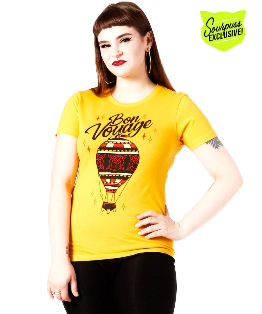 Bon Voyage! Who is ready for a vacation? Sign me up if it involves this gorgeous rose tattoo hot air balloon. This Sourpuss graphic has a retro vibe with the diamond accents. Printed locally with the softest inks on a gold colored Next Level Apparel boyfriend tee. This is a retail exclusive!