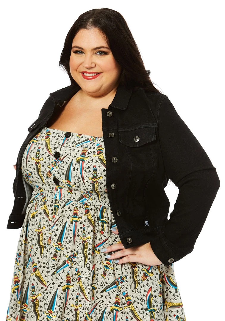 Every ghoul needs a perfect black jacket in their closet! The new Essential Stretch Denim Jacket in Black is the ticket! This comfortable, stretchy denim jacket features side pockets, an inside pocket, and branded Sourpuss hardware. It’s a perfect all-season jacket that you’re going to want to get your claws on immediately!