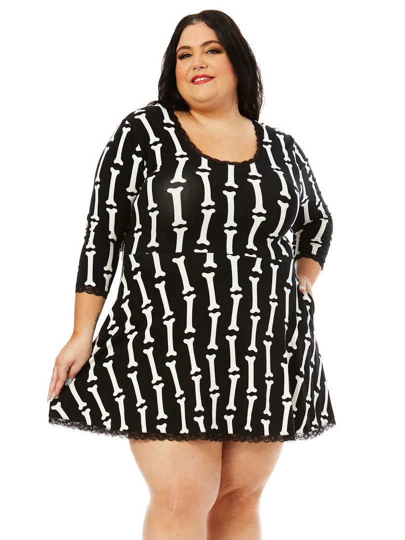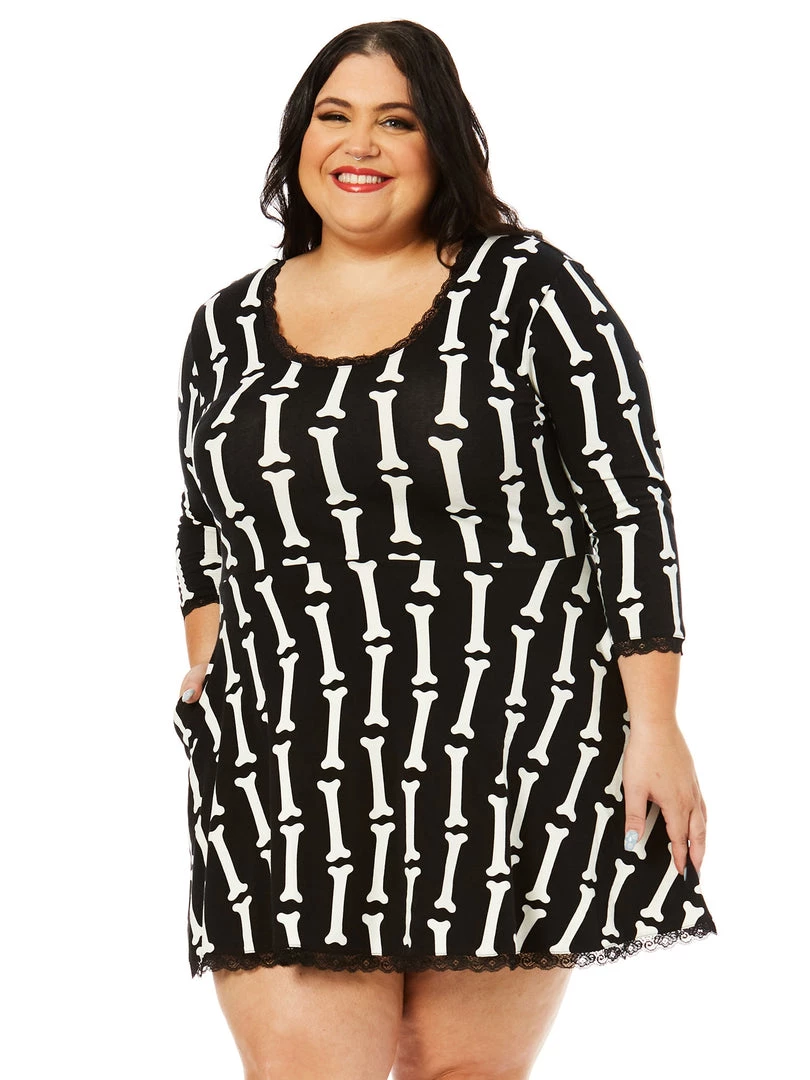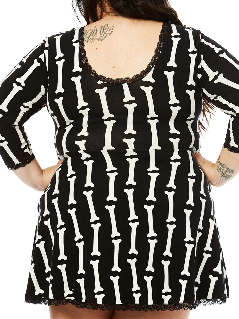 The Miss Bones Low-Back dress is a brand new silhouette, and we’re obsessed! This skater dress features a plunging low back – perfect for showing off your tattoos! It is trimmed in a soft, dainty lace and has our very own Miss Bones artwork printed on it using a reactive print, so it’s super soft and will never ever crack! (And yes it has pockets!)