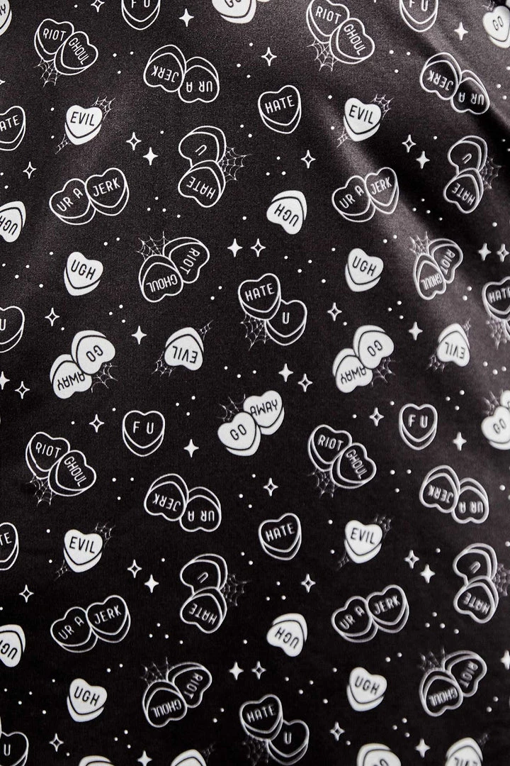There’s nothing wrong with being a little rotten now and then, and our new Rotten Hearts Betsy Dress makes being snarky positively adorable! This new silhouette features puff sleeves with an elastic ruffled hem, ruffles on the neck and skirt hem, and a deep v neckline with ruching down center front. Of course the main attraction is the candy hearts print, featuring spiderwebs and candy hearts with “riot ghoul”, “go away”, “evil”, and more!
