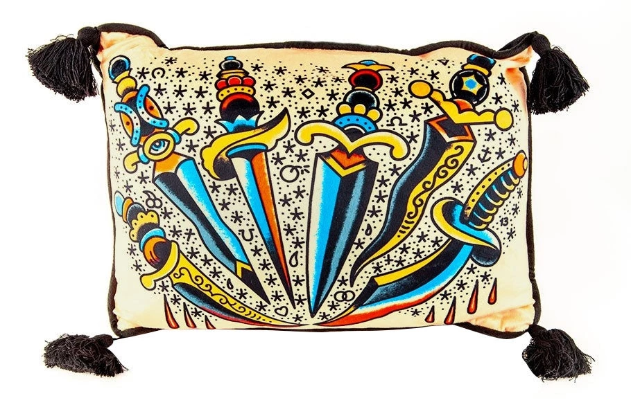 The new Tattoo Daggers Pillow is just what your home needs! This amazing dagger design was created for Sourpuss by artist Steve Fawley. Each pillow is made out of a printed velvet with decorative tassels and piping. We think these would look amazing in any tattoo studio, too!