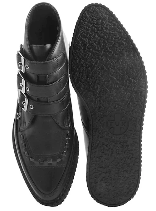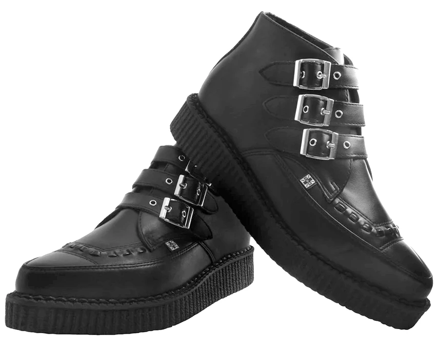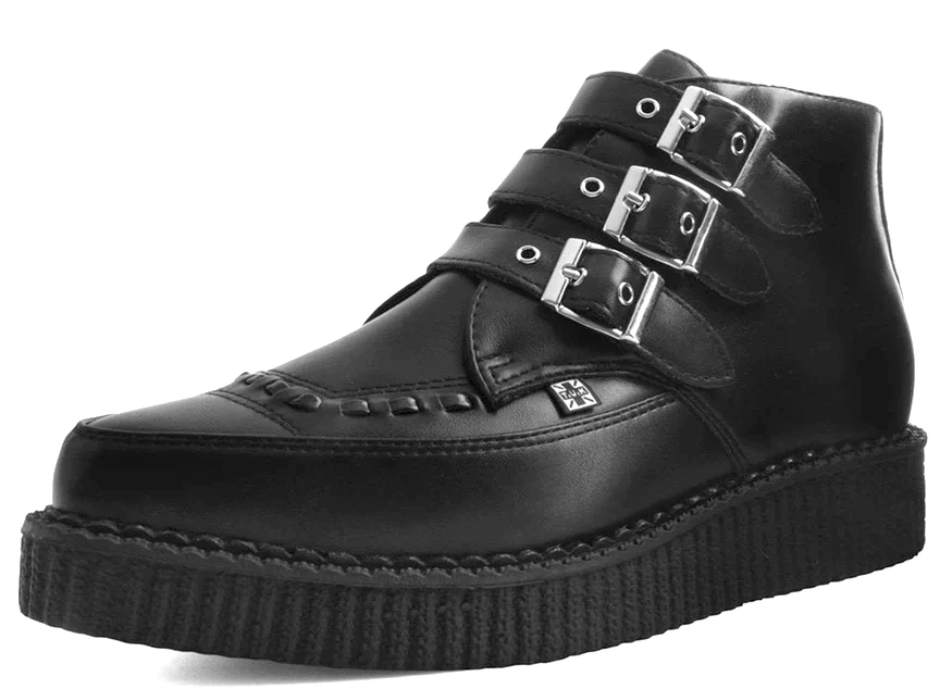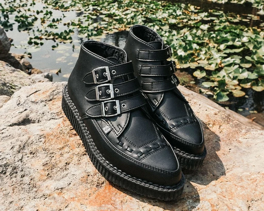 Keep your style sharp with these rocker ankle creeper boots that offers our same bold, iconic style in a vegan alternative option. These 3 Buckle Pointed Creeper Boots features an all-black upper made of their high quality TUKskin™ material — polishable synthetic faux leather that is both soft and breathable. Has a three-strap metal buckle closure with a low sole platform that measures approximately 1 ¼” at the heel and ¾” in the front. Includes removable gel insoles for added comfort. Shoe can be easily cleaned with mild soap and water.