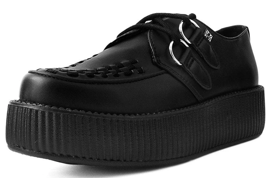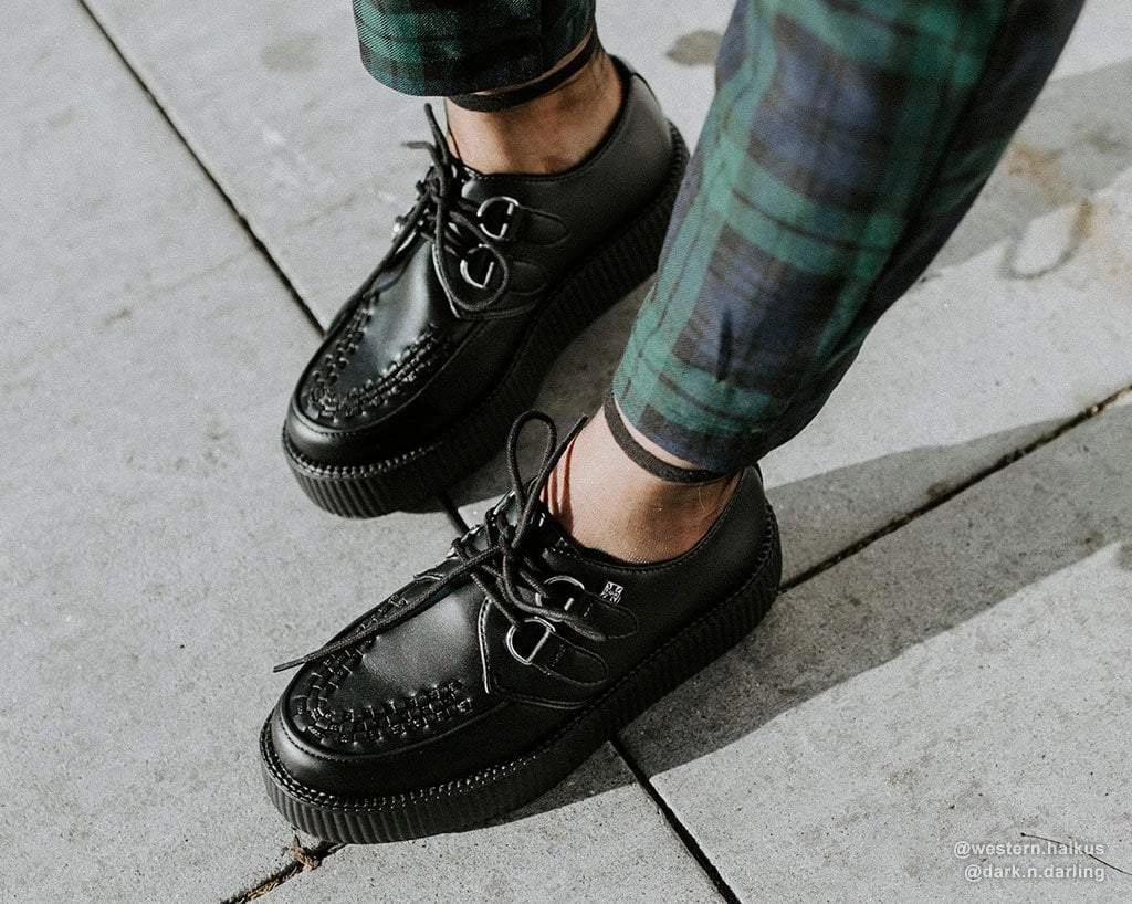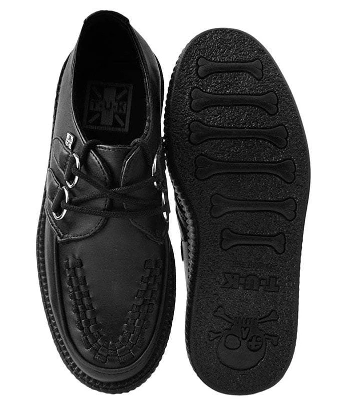 Score a wardrobe win with these classic round toe creepers that offers the same bold, iconic T.U.K. style in a vegan alternative option. Has an all-black upper made of high quality TUKskin™ material — polishable synthetic faux leather that is both soft and breathable. Features black woven interlace detailing, lace-up fastening, and a lightweight VIVA mondo sole that is approximately 1 ¾” at the heel and 1 ¼” in the front. Has removable memory foam padding for added comfort.