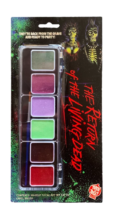 Designed by Trick or Treat Studios, The Return of the Living Dead Makeup Kit is the simplest way to transform yourself into a gruesome Return of the Living Dead Zombie. Each color was meticulously selected to match the color pallet that is used by the Master FX Artists responsible for all the carnage on The Return of the Living Dead. The Return of the Living Dead Makeup Kit comes with six makeup cakes and a makeup brush so that you have everything you need to create your own horrifying Walker look. Grab some torn up clothes and go out and stalk the living this Halloween!