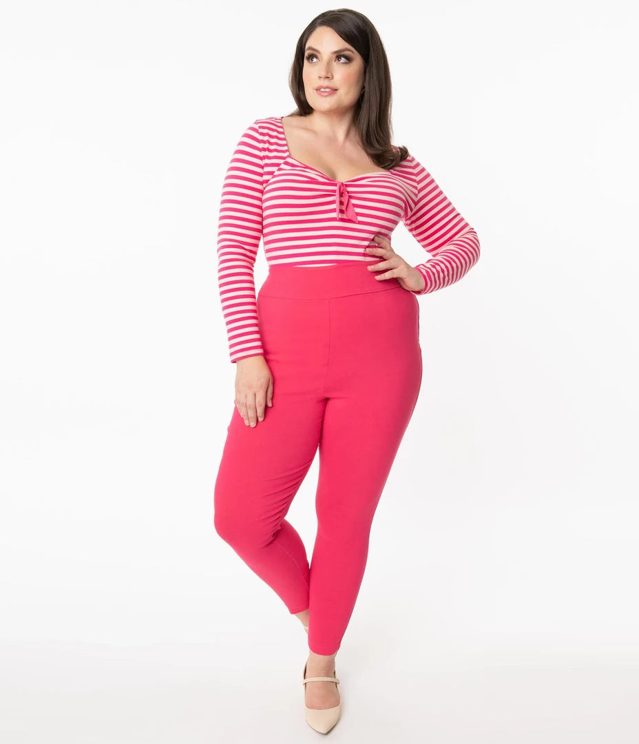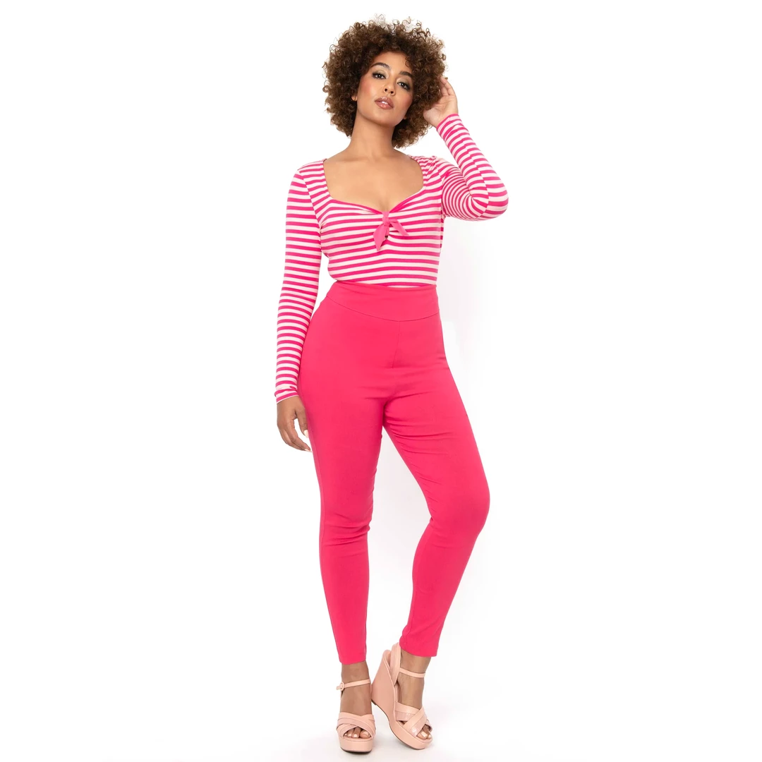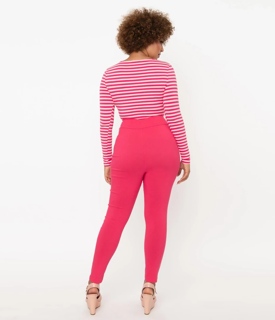 Let ’em see ya coming and going! Crafted from a hot pink stretch fabric, the Rizzo Pants from Unique Vintage are a vintage loving gals dream pants! The classic fit and dramatic high waist slims and elongates your figure in the best way. The cigarette skinny leg ends at the ankles, for the perfect retro look! Zips close at side.