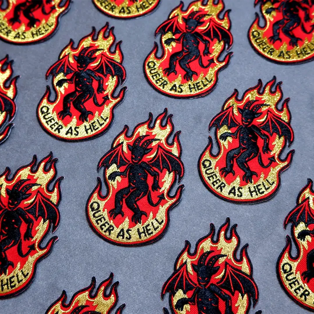 Here and Queer!! No shame in being the cutest lil’ queer demon in all of hell. This Queer As Hell patch from Cat Coven features black and metallic gold thread on a bold red background.