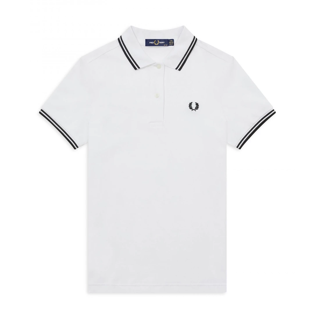 This white polo with black tipping on the collar and sleeves has the look of the original Fred Perry shirt but updated with a small amount of elastane for a better fit. In keeping with classic Fred Perry style, this shirt has the standard twin tipped collar and sleeves and a two-button placket and pairs perfectly with a skirt or jeans. **Listed in US Sizing!