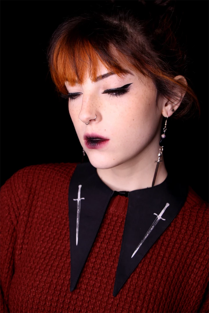 Perfect for complimenting any outfit, the Ultra Violence Reversible Collar from Lively Ghosts features a pair of silver swords on one side, and silver scythes on the reverse. It is slightly adjustable with the satin ribbon tie.