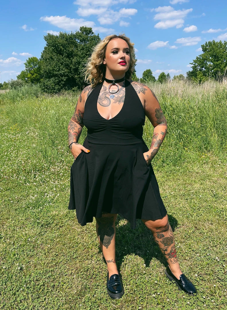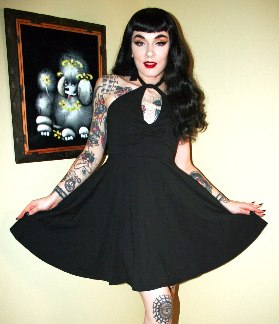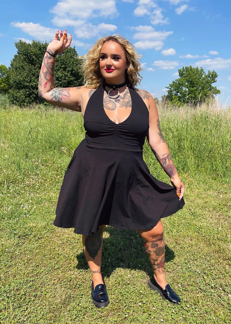 What’s this? Another brand-spanking-new Sourpuss silhouette? It is! The Black Halter Skater dress is the ultimate little black dress for Summer, made out of a stretchy and breathable cotton jersey, with adjustable halter neck ties and pockets!