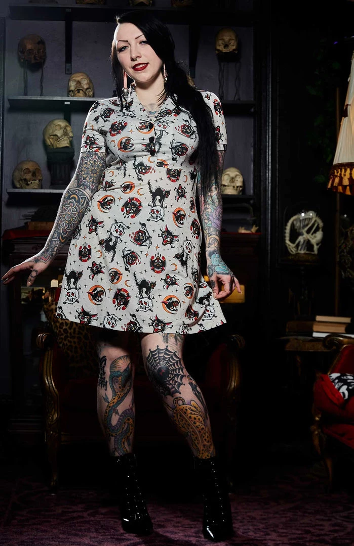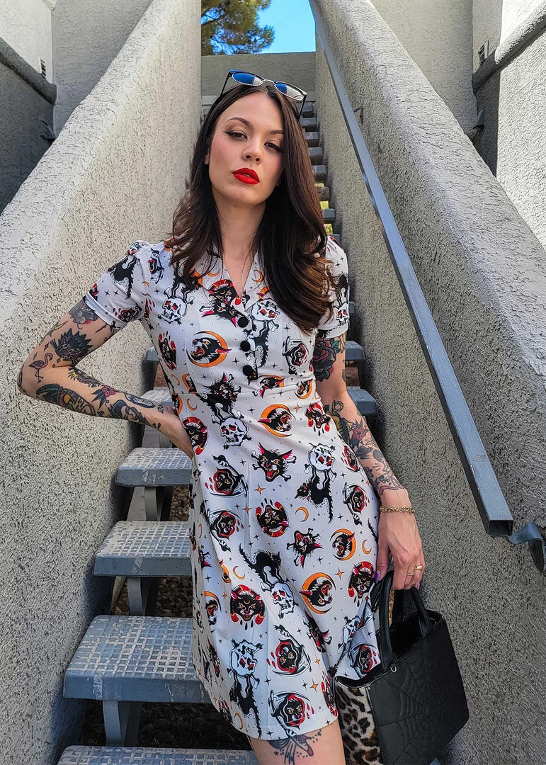 Black cats are the best, so naturally we had to create a new Rosie dress featuring our favorite felines! The Friday the 13th Rosie dress has artwork by Jared Gaines, with black cats, horseshoes, skulls, the works! We love the washed out gray background and perfect traditional tattoo style colors. The Rosie dress has a 3 button center front closure and is super stretchy for a perfect fit!