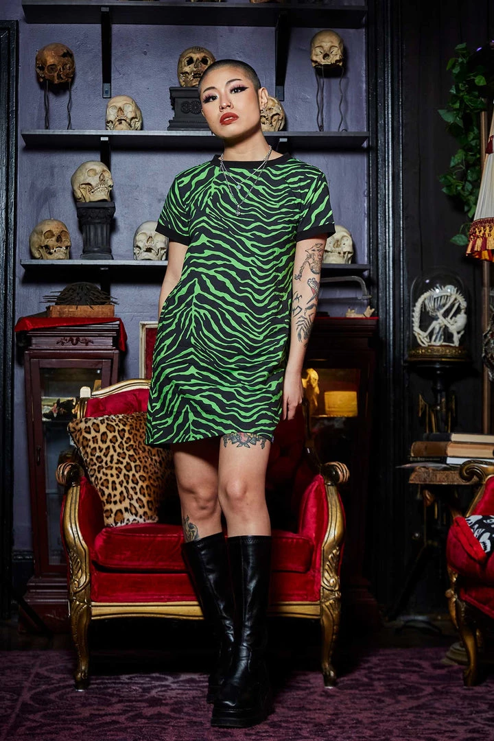 The Zebra print of your dreams is here! Be cozy at home or on the go in the new Psycho Zebra Ringer Tee dress. This dress has a more relaxed fit, with contrast black rib on the neck and sleeves, and a Sourpuss label at the hem.