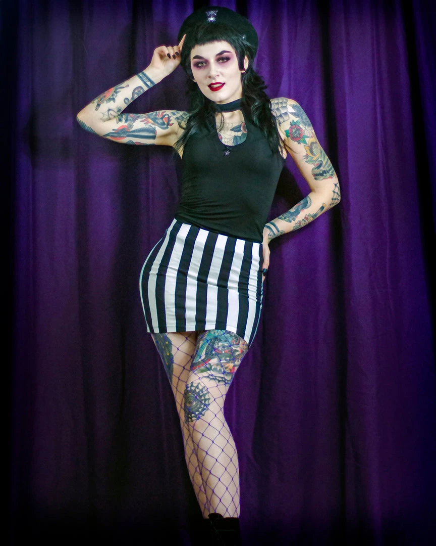 The new striped mini skirt in black and white is an instant classic! This stretchy mini skirt is made out of a cotton spandex knit and has an elastic waistband for extra comfort and fit!